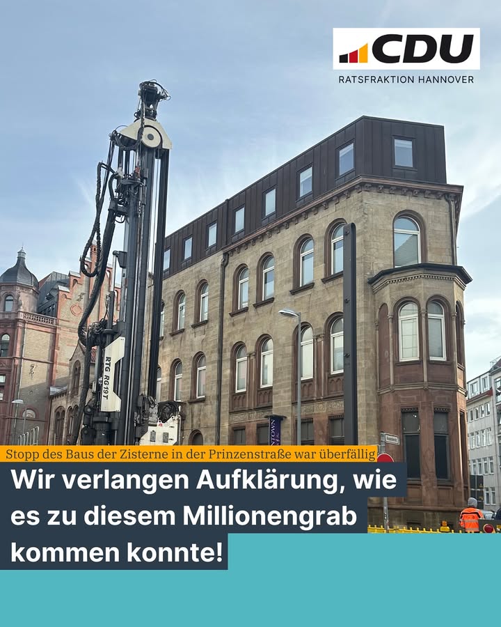 mehrDer Stopp des Projektes #Großzisterne unterhalb der #Prinzenstraße kommt viel zu spät. Schon nach den ersten massiven Gebäudeschäden hätten #Oberbürgermeister Onay und Dezernentin Ritschel das Projekt stoppen müssen ? stattdessen wurde weitergebaut. Ergebnis: ein #Millionengrab für die Steuerzahler und gravierende Schäden für #Eigentümer."Hier ist ein massiver Schaden in Millionenhöhe entstanden. Da können Onay und Ritschel nicht achselzuckend zur Tagesordnung übergehen", sagt unser umweltpolitischer Sprecher @maximilian.oppelt.Wir erwarten nun schnelle, flexible und unbürokratische #Hilfe für die Betroffenen ? und eine vollständige Aufklärung, wie es zu diesem #Desaster kommen konnte.#cdu #cduhannover #hannover #zisterne #bau #bauschäden #kosten