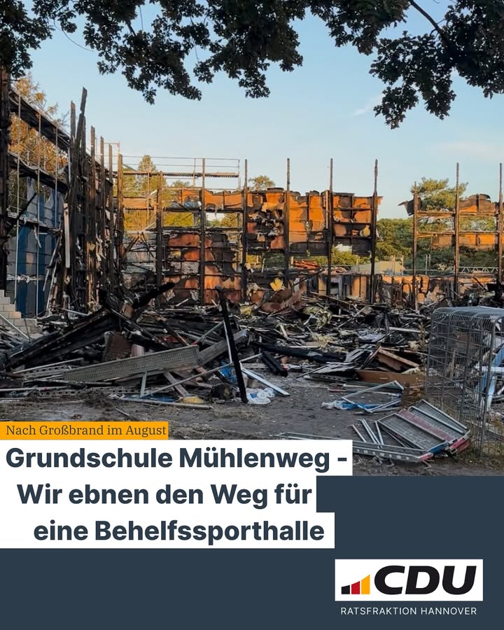 mehrNach dem verheerenden #Brand der Sporthalle der #Grundschule Mühlenweg im August geht es nun endlich voran: Im #Bauausschuss haben wir beschlossen, schnellstmöglich eine Interimssporthalle zu errichten."So schaffen wir endlich wieder #Normalität für die Schülerinnen und Schüler. Auch die Vereine in Misburg-Anderten können bald wieder zuverlässig mit dem Hallentraining beginnen?, so unser baupolitischer Sprecher und Ratsherr aus Misburg, @patrick.hoare.Der Bau der Leichtbauhalle müsse nun schnell vorangehen, darin ist sich die Ratspolitik einig. Geplant sei, dass die Halle binnen eines Jahres errichtet werde und für fünf Jahre, bis zum Bau einer neuen #Sporthalle, zur Verfügung stehe.#cdu #cduhannover #hannover #misburg #grundschulemühlenweg #großbrand #sport #verein