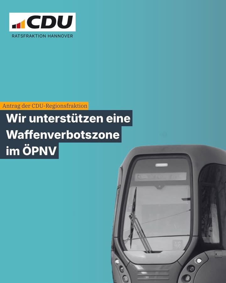 mehrDie CDU/FDP-Gruppe der Region Hannover fordert eine Waffenverbotszone im gesamten ÜSTRA-Verkehrsgebiet - also in allen Bussen und Bahnen sowie an Haltestellen und in U-Bahn-Stationen.In den vergangenen Jahren kam es im Nahverkehr der Region Hannover wiederholt zu Vorfällen, bei denen Waffen im Spiel waren. Hierdurch wurde das Sicherheitsgefühl von Fahrgästen und Fahrpersonal erheblich beeinträchtigt.Auch wir als CDU-Fraktion der Stadt Hannover sind überzeugt davon, dass eine solche Zone effektiv Gewalt vorbeugt, das Sicherheitsgefühl stärkt und ein klares Signal gegen Bedrohungen setzt.Beispiele aus anderen Bundesländern zeigen positive Effekte. Wir sehen die Maßnahme als wichtigen Schritt, um mehr Menschen für den Nahverkehr zu gewinnen.#cduhannover #nahverkehr #üstra #regionhannover #sicherheit @cduregionsfraktion Foto: Andreas Lilienthal, CC BY-SA 4.0, via Wikimedia Commons